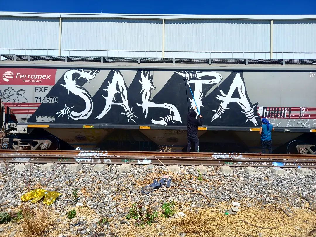 Aunque pongan más alto el muro como sea lo saltamos. Salta, evade, brinca dale la vuelta! Tren en colaboración con @sabyiduria en la cámara @poemads #blockgraffiti #traingraffiti #vlockenegro #vlocke #salta #ningunhumanoesilegal #ilegalyque
