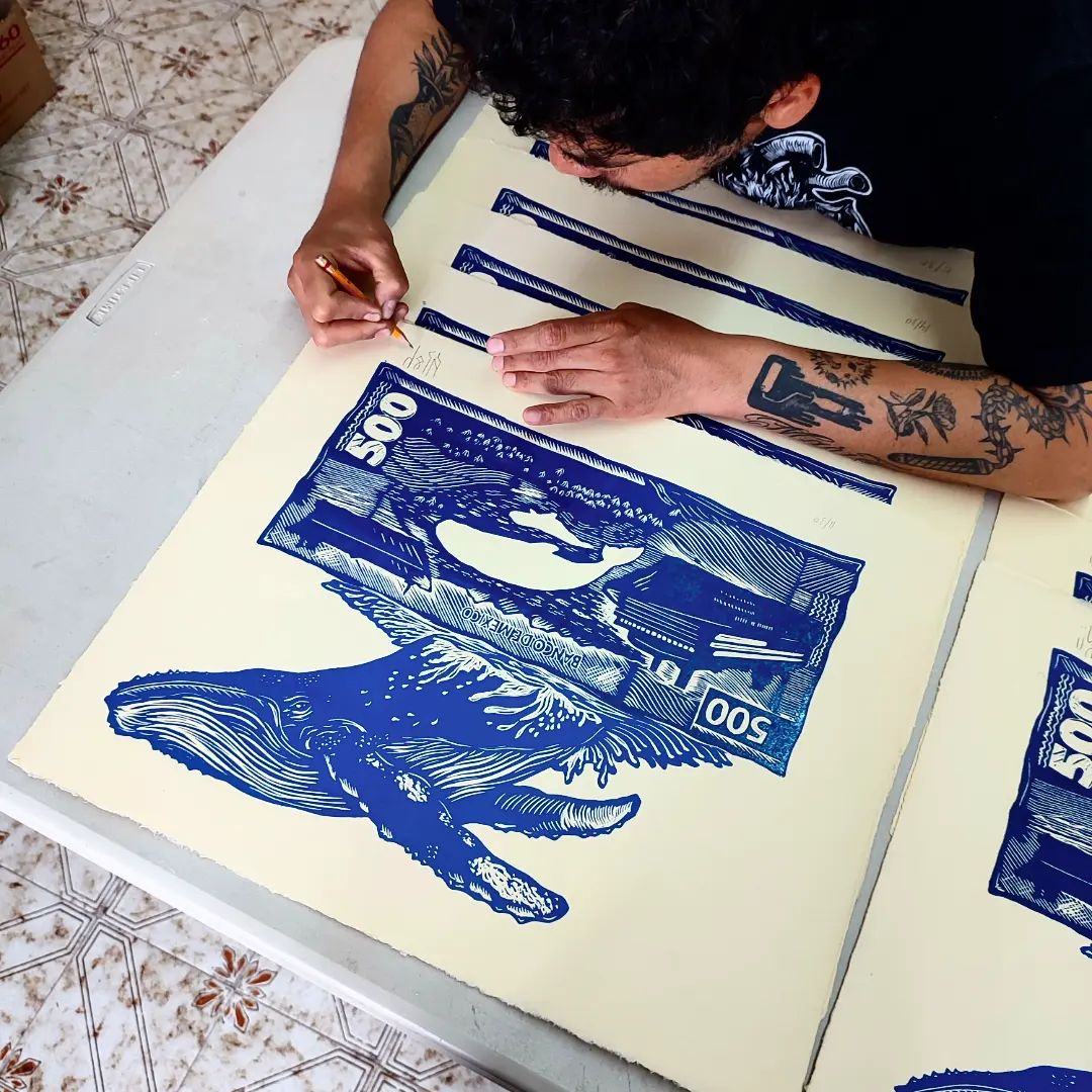 Grabado en linóleo, parte se mi serie que cuestiona el discurso oficial de papel moneda, impreso a dos tintas, en papel 100% algodón, serie 1/30