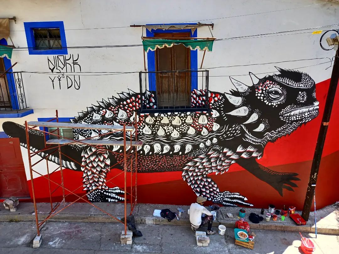 Phyronosoma taurus, Torito, o lagartija cornuda que habita la reserva de biósfera Cuicatlán-Tehuacán mi participación junto a @sabyiduria para @festival_mural_cuicatlan.2023 donde se trata de crear conciencia acerca del cuidado a estos espacios naturales para la concervación de su fauna y flora, fué una increible experiencia llena de aprendisajes y buena ondita. Muchas gracias a @axolotlcollective por la invitación.