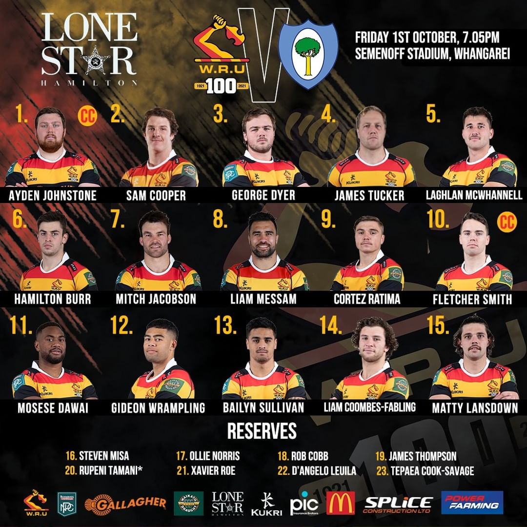 Here is your Waikato NPC team to take on @northlandrugby at Semenoff Stadium, Whangarei tomorrow evening (Friday 1st October), kickoff 7.05pm. All thanks to Lone Star Rototuna (Rototuna - Hamilton)💪🏉🐮