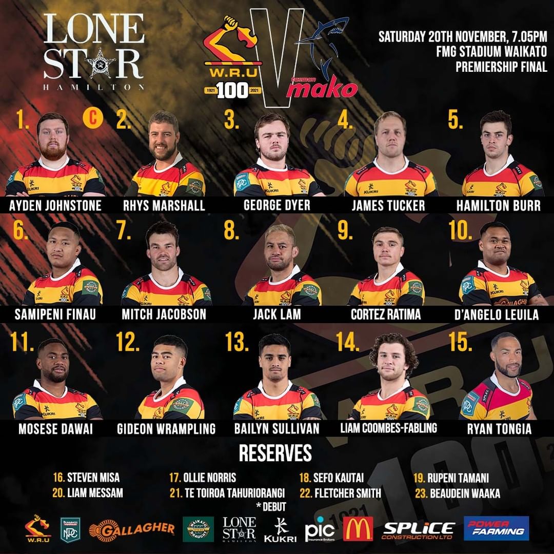 Here is your Waikato team to face @tasmanmako in the @bunningsnpc Premiership Final, @fmgstadiumwaikato, tomorrow evening (Saturday 20th November), kickoff 7.05pm. All thanks to Lone Star Rototuna (Rototuna - Hamilton) 💪🏉🐮