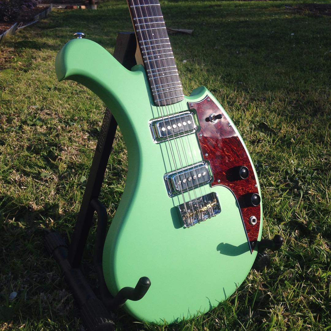 This bad boi heading over to @lechatdevenus in Paris on Monday. Huge thanks to Etienne for my first international order, to @pro_paint_guitars for the top shelf paint job, and Rossi for the setup. Specs: Macassar ebony fretboard, rock maple neck, New Guinea rosewood body. Gfs nyIIs, gotoh tuners, wilkinson bridge, cts pots and switchcraft jack. Sounds goooood 🤙