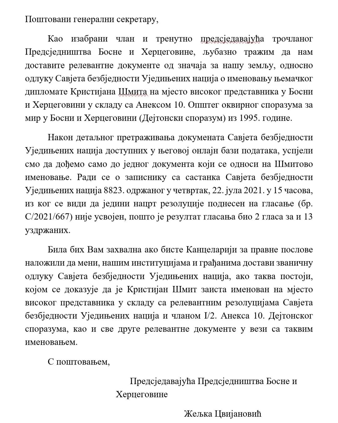 Као изабрани српски члан и тренутно предсједавајућа трочланог Предсједништва БиХ, званично сам затражила од генералног секретара Уједињених нација Антониа Гутереша одлуку Савјета безбједности УН о именовању њемачког дипломате, Кристијана Шмита, на мјесто високог представника у БиХ у складу са Анексом 10. Општег оквирног споразума за мир у БиХ из 1995. године.