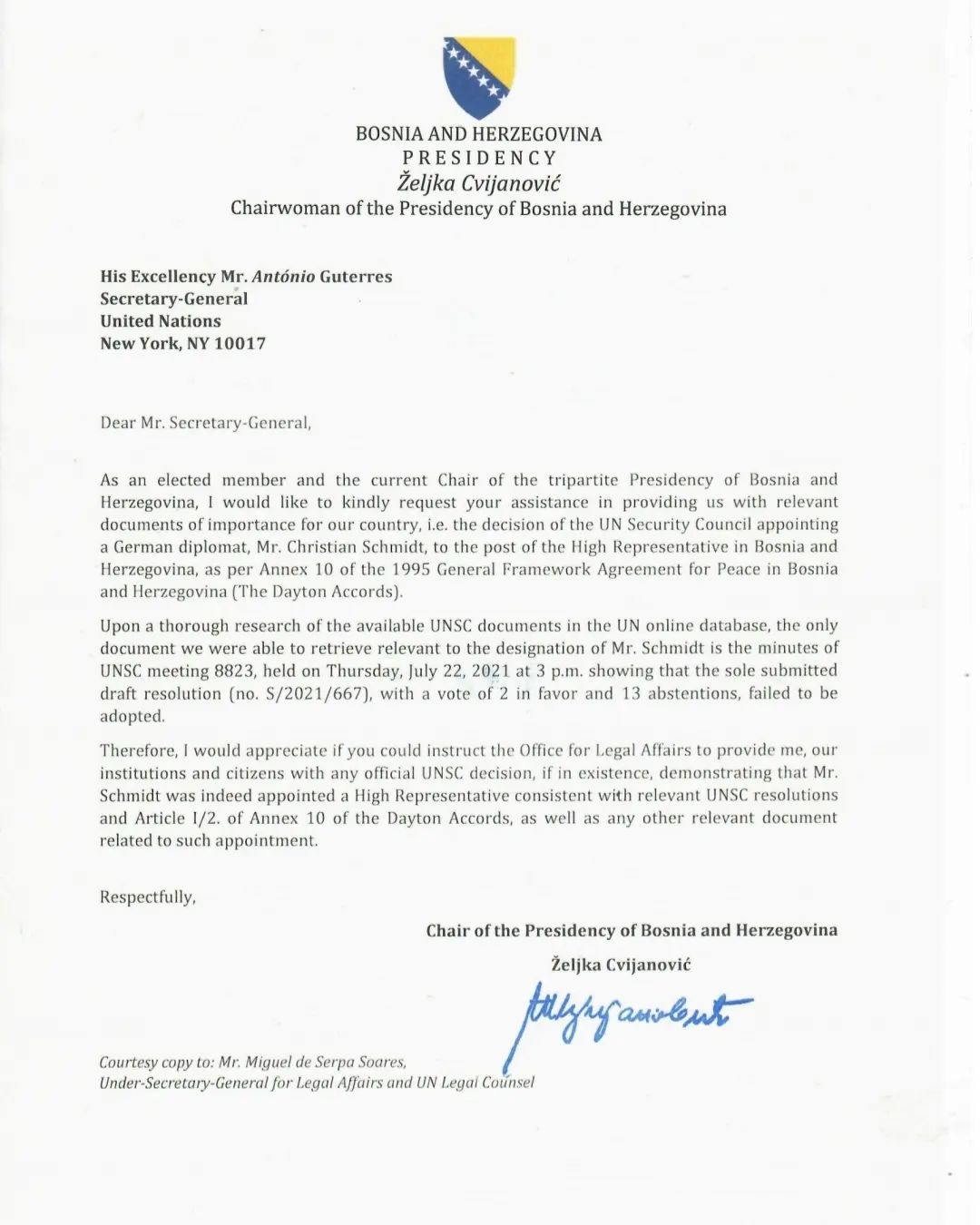 Као изабрани српски члан и тренутно предсједавајућа трочланог Предсједништва БиХ, званично сам затражила од генералног секретара Уједињених нација Антониа Гутереша одлуку Савјета безбједности УН о именовању њемачког дипломате, Кристијана Шмита, на мјесто високог представника у БиХ у складу са Анексом 10. Општег оквирног споразума за мир у БиХ из 1995. године.