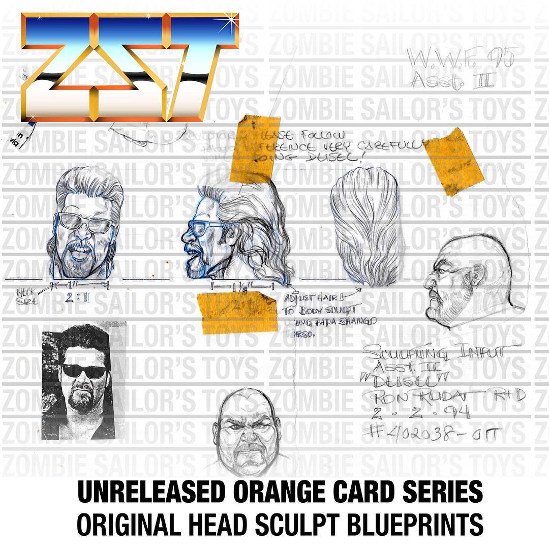 From the cancelled Orange card series that was supposed to come out AFTER the green cards - drawing is dated Feb 2, 1994 - absolutely beautiful - please note when I acquired these there were drawings of Bam Bam Bigelow's face/ head taped onto this blue print, who knows why, but I'm certainly not removing them. It's awesome to see a black and white Diesel photo taped down to the drawing for reference