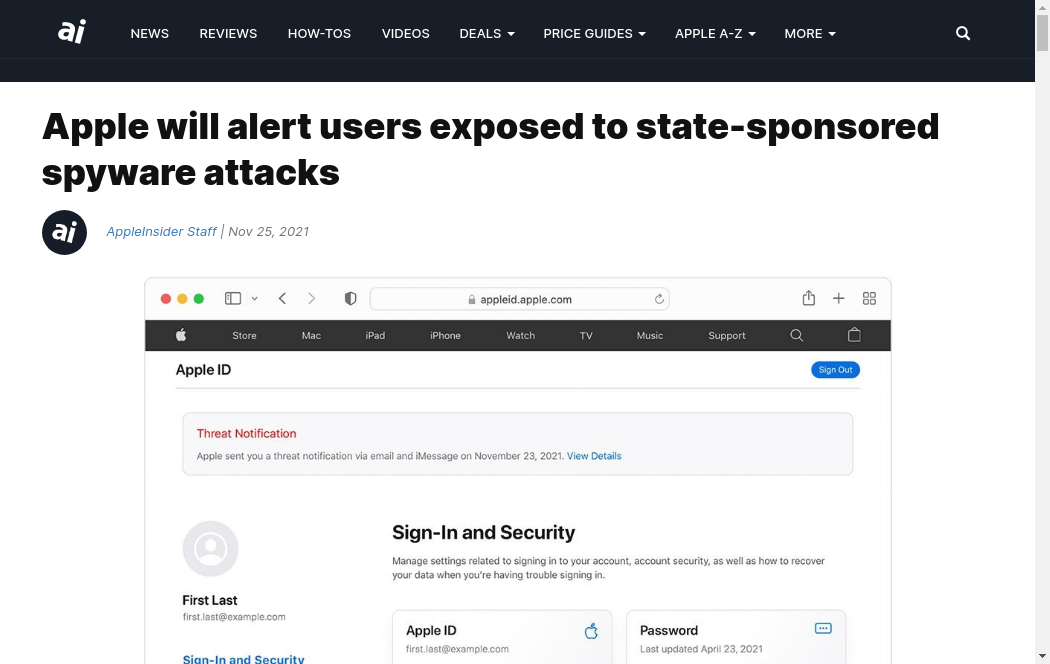 | https://appleinsider.com/articles/21/11/25/apple-will-alert-users-exposed-to-state-sponsored-spyware-attacks | Thu, 25 Nov 2021 12:35:38 GMT | Archived webpage |