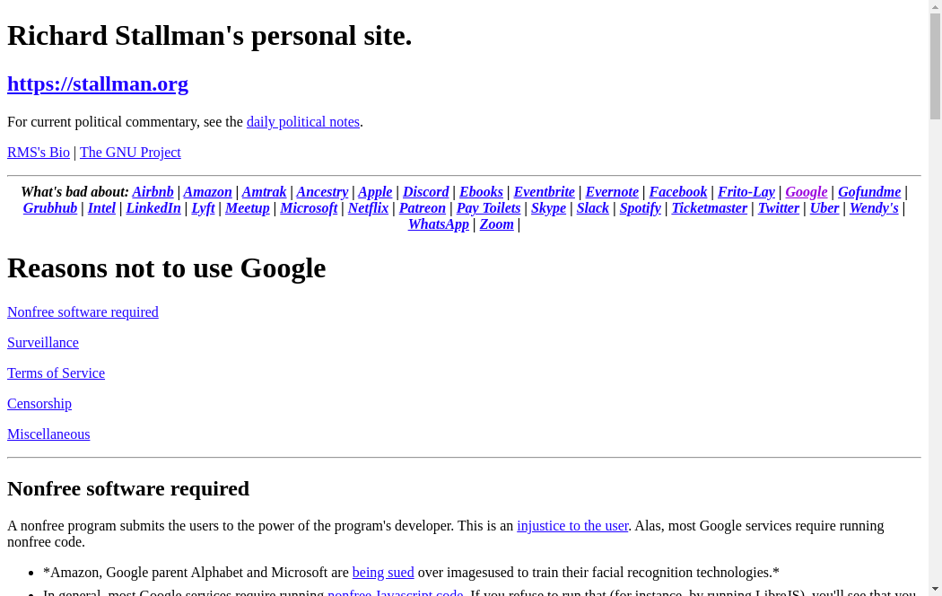 | https://stallman.org/google.html | Wed, 01 Dec 2021 01:15:22 GMT | Archived webpage |