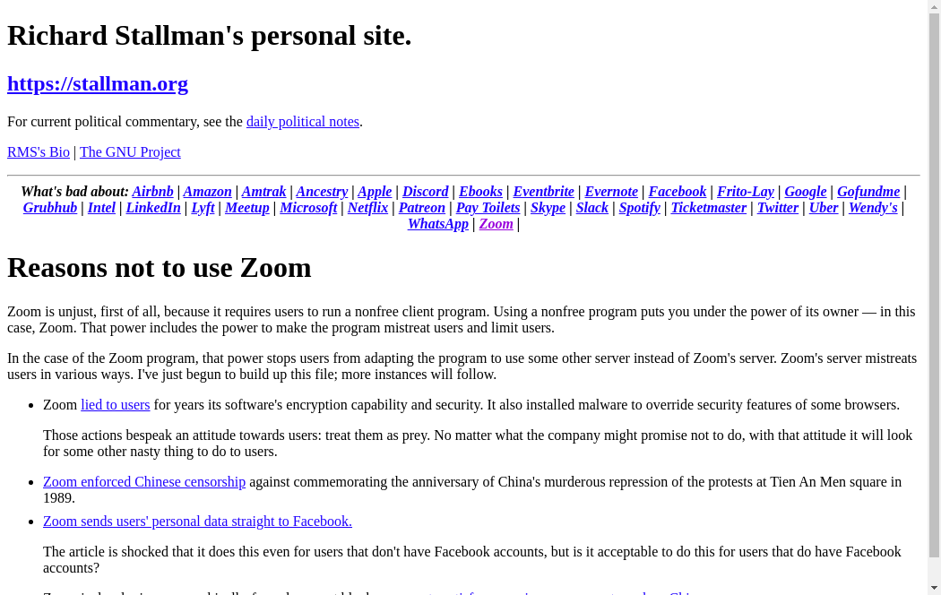 | https://stallman.org/zoom.html | Wed, 01 Dec 2021 01:16:40 GMT | Archived webpage |