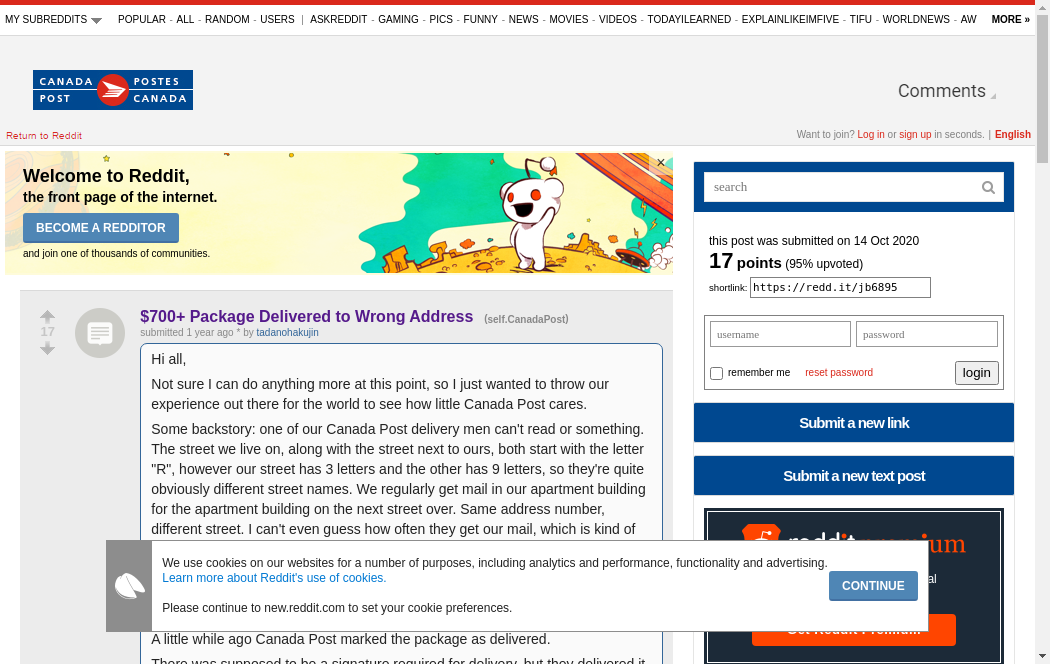 | https://old.reddit.com/r/CanadaPost/comments/jb6895/700_package_delivered_to_wrong_address/ | Fri, 19 Nov 2021 19:08:05 GMT