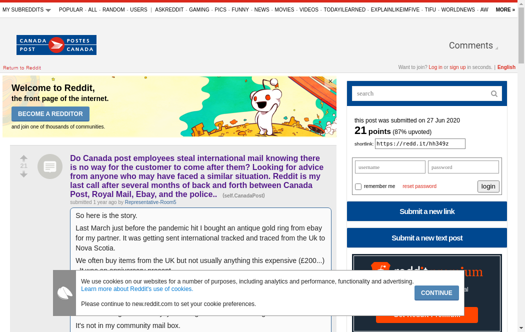 | https://old.reddit.com/r/CanadaPost/comments/hh349z/do_canada_post_employees_steal_international_mail/ | Fri, 19 Nov 2021 19:21:11 GMT