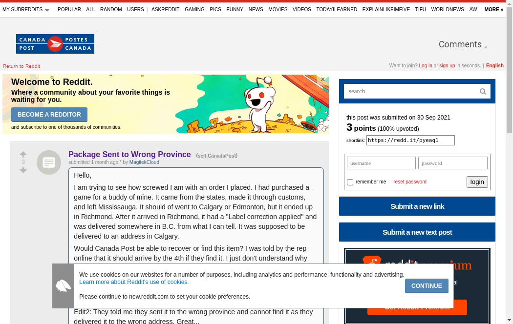 | https://old.reddit.com/r/CanadaPost/comments/pyeaq1/package_sent_to_wrong_province/ | Fri, 19 Nov 2021 19:20:18 GMT