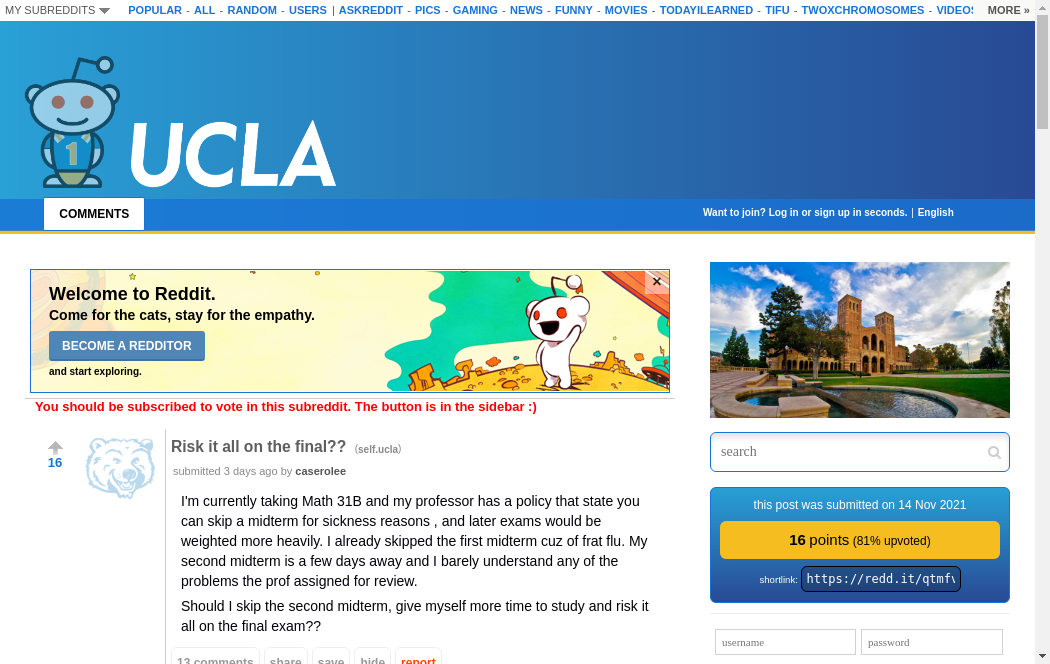 | https://old.reddit.com/r/ucla/comments/qtmfvb/risk_it_all_on_the_final/ | Sun, 14 Nov 2021 18:56:28 GMT