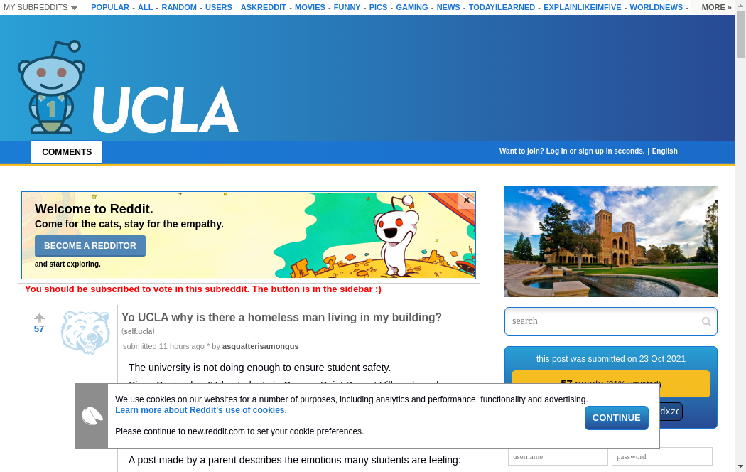 | https://old.reddit.com/r/ucla/comments/qdxzot/yo_ucla_why_is_there_a_homeless_man_living_in_my/ | Sat, 23 Oct 2021 16:16:18 GMT
