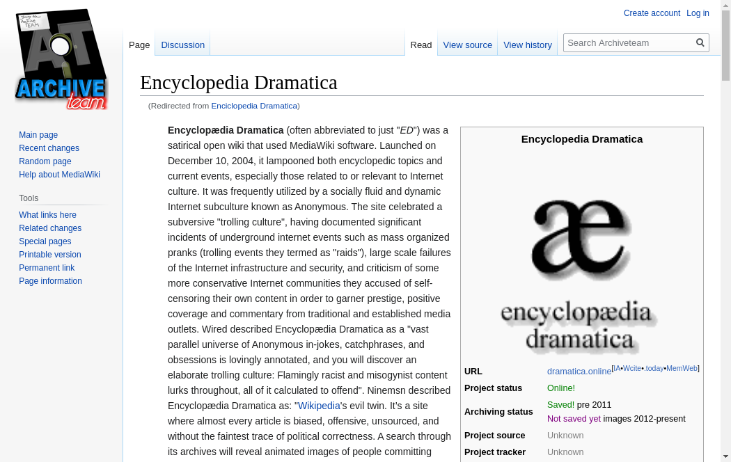 | https://wiki.archiveteam.org/index.php/Encyclopedia_Dramatica | Tue, 19 Oct 2021 04:17:05 GMT