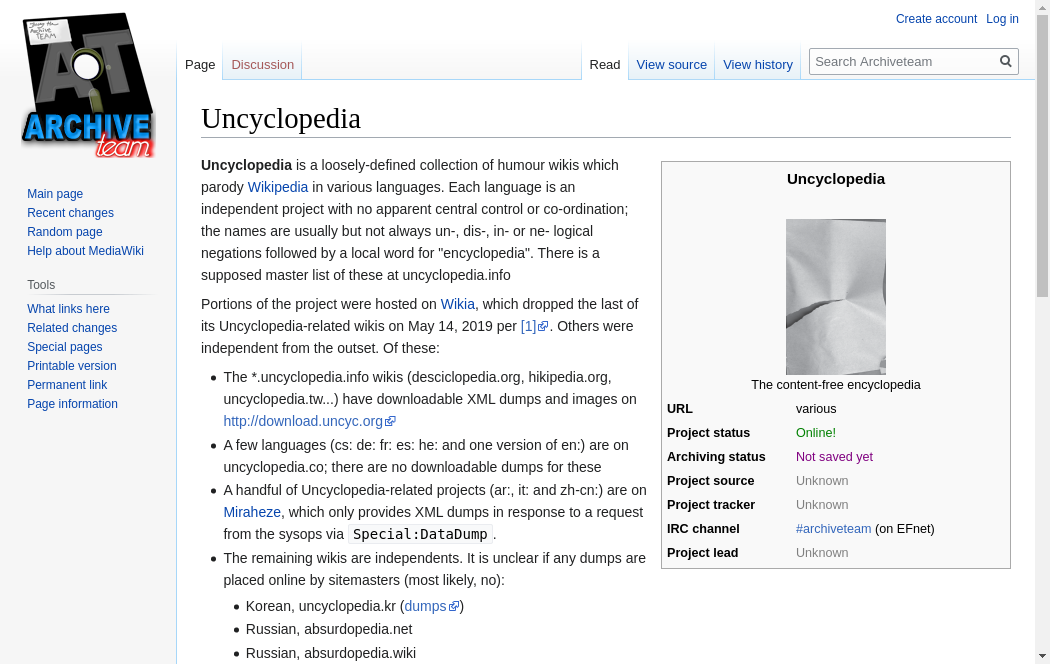 | https://wiki.archiveteam.org/index.php/Uncyclopedia | Tue, 19 Oct 2021 04:04:13 GMT