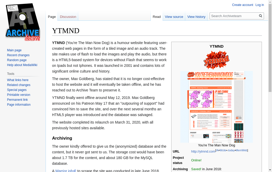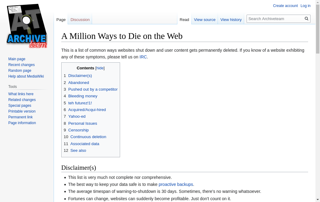 | https://wiki.archiveteam.org/index.php/A_Million_Ways_to_Die_on_the_Web | Tue, 19 Oct 2021 21:01:04 GMT