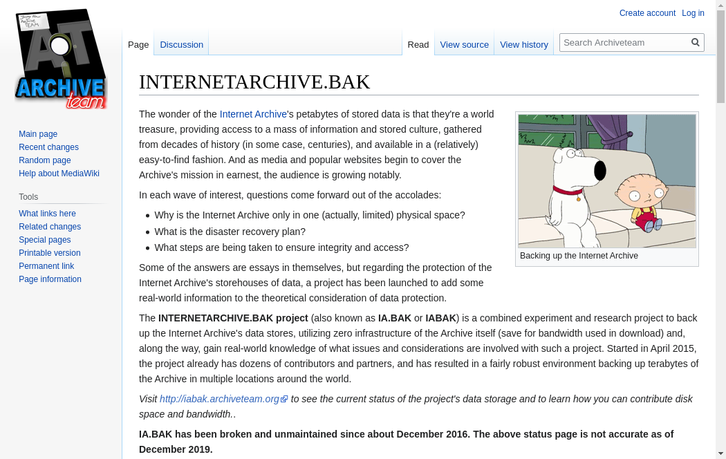 | https://wiki.archiveteam.org/index.php/INTERNETARCHIVE.BAK | Mon, 18 Oct 2021 22:19:20 GMT