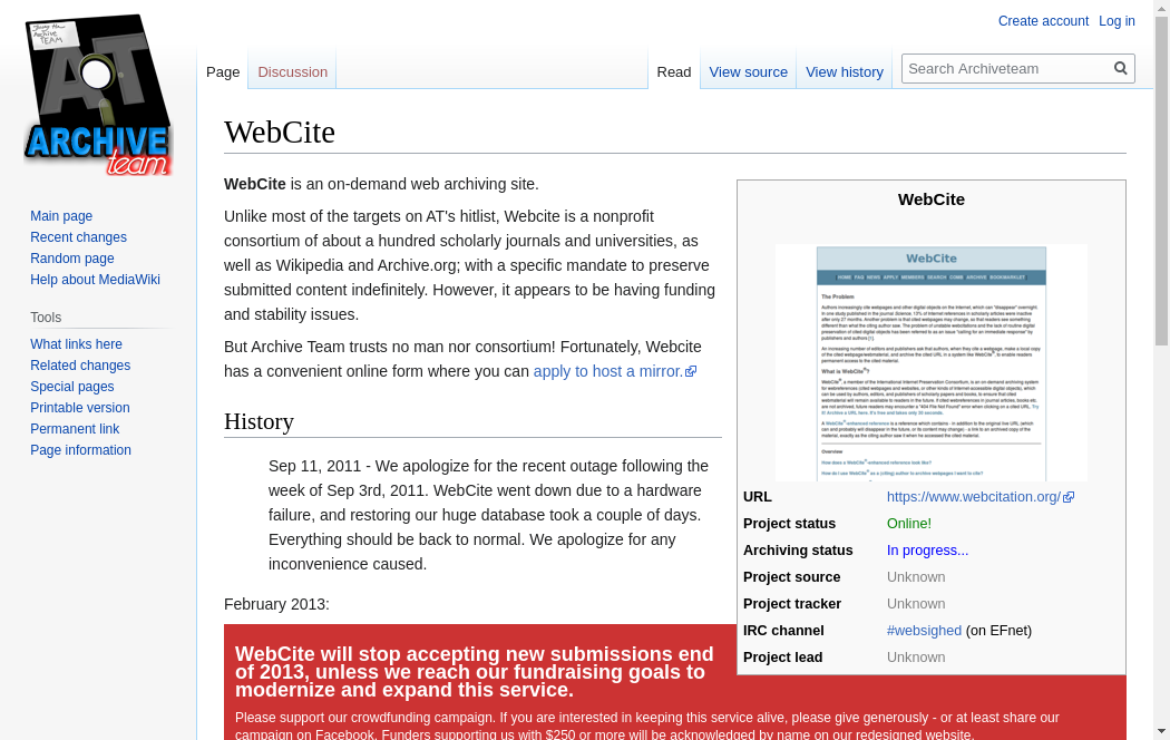 | https://wiki.archiveteam.org/index.php/WebCite | Tue, 19 Oct 2021 02:07:07 GMT