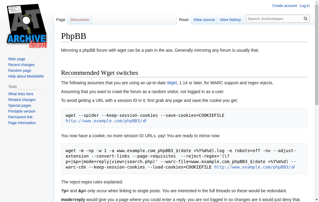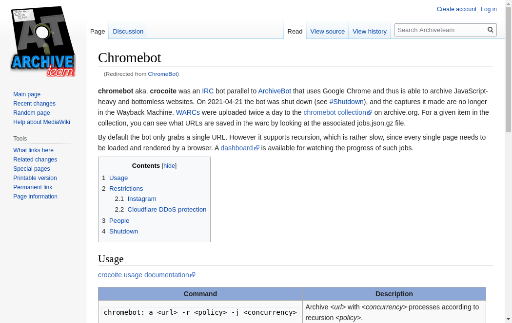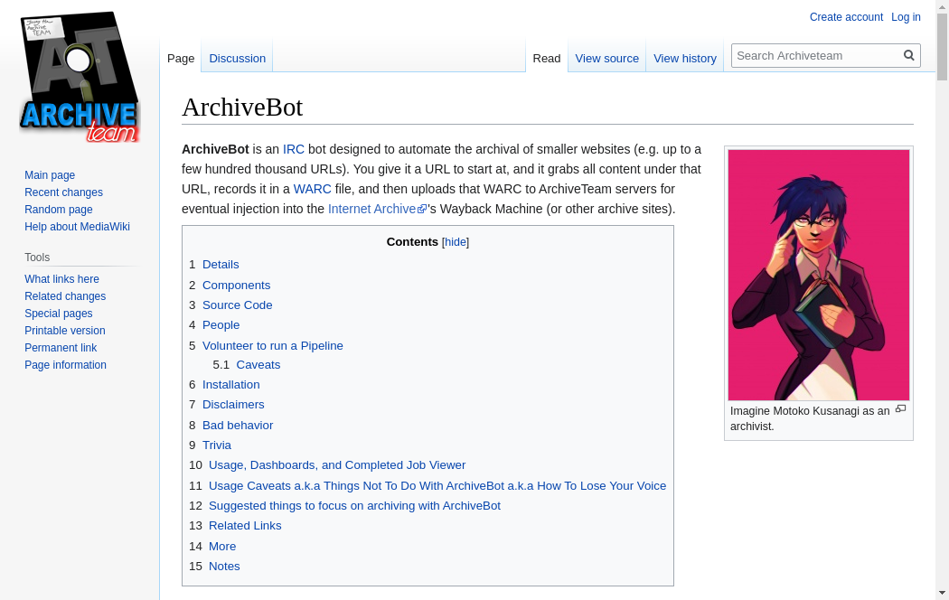 | https://wiki.archiveteam.org/index.php/ArchiveBot | Tue, 19 Oct 2021 01:40:58 GMT