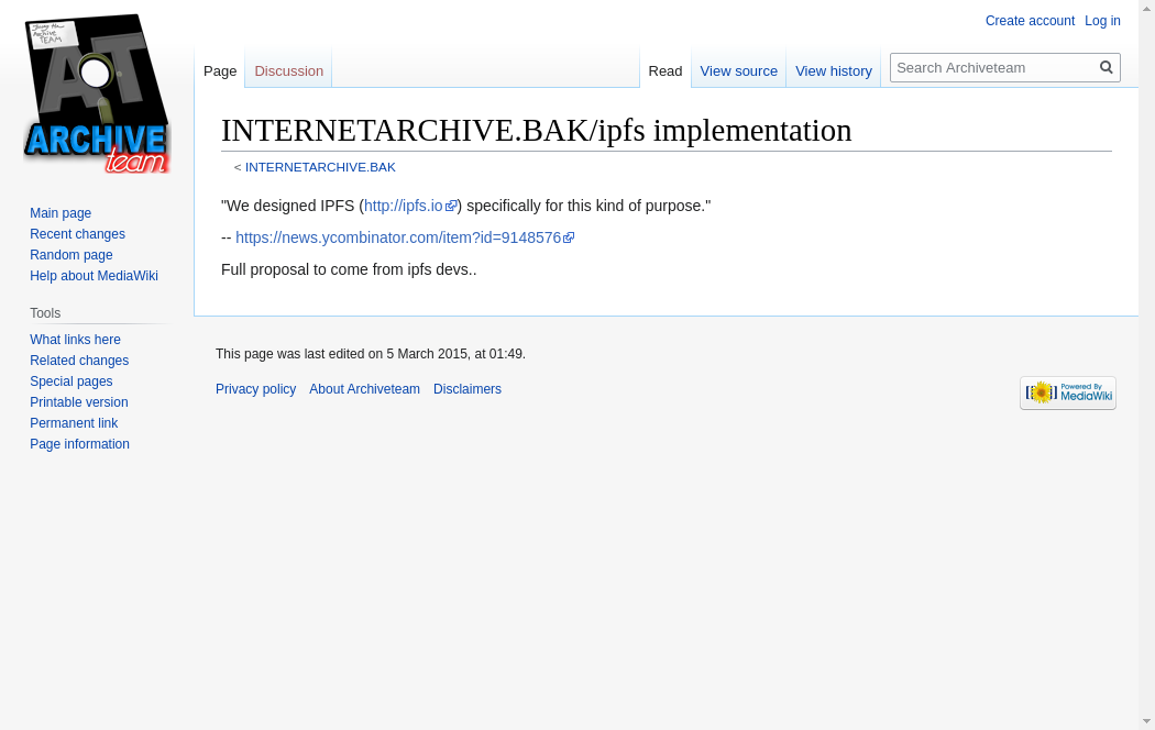 | https://wiki.archiveteam.org/index.php/INTERNETARCHIVE.BAK/ipfs_implementation | Tue, 19 Oct 2021 00:14:10 GMT