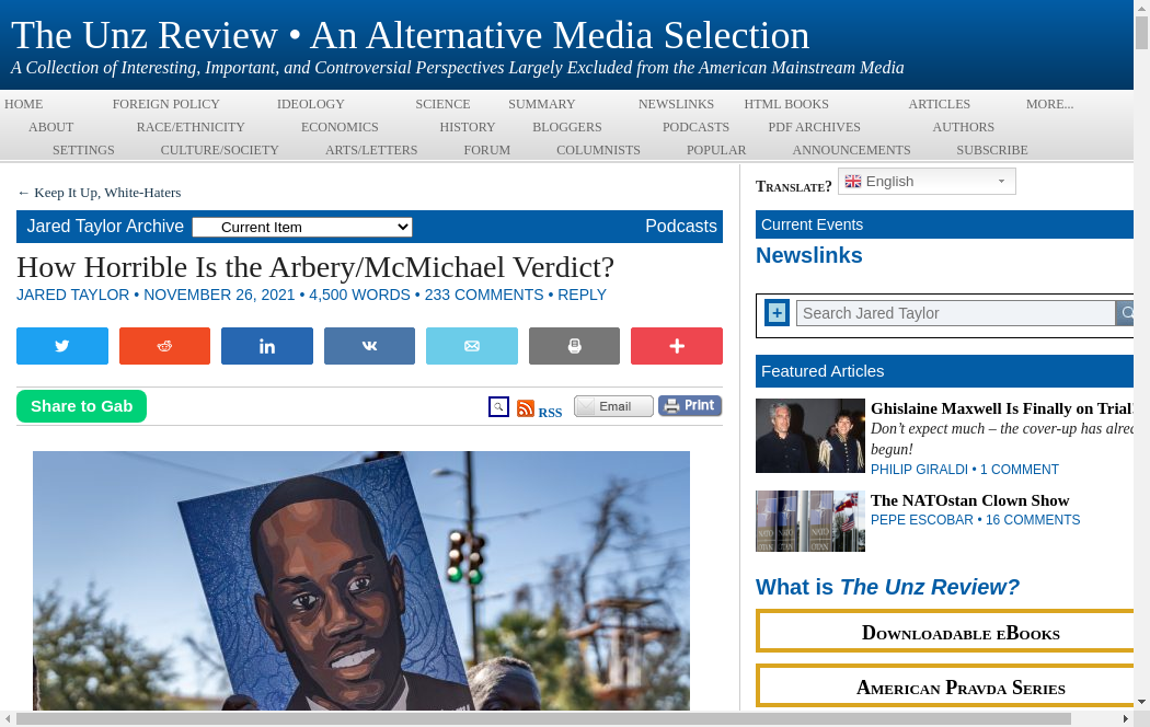 | https://www.unz.com/jtaylor/how-horrible-is-the-arbery-mcmichael-verdict/ | Tue, 30 Nov 2021 06:51:55 GMT | Archived webpage |
