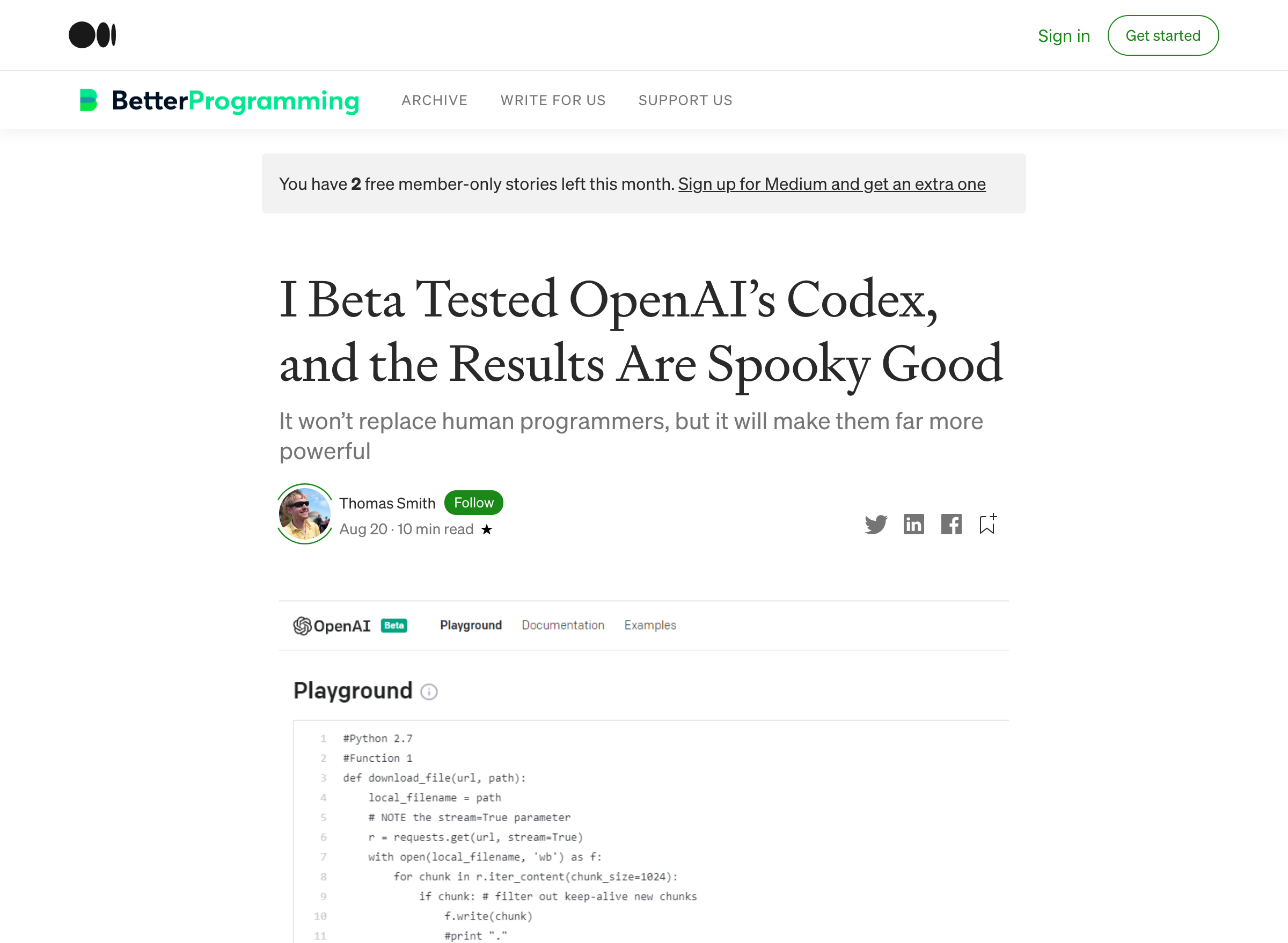 | https://betterprogramming.pub/i-beta-tested-openais-codex-and-the-results-are-spooky-good-e282a1874c79 | Mon, 23 Aug 2021 12:53:24 GMT