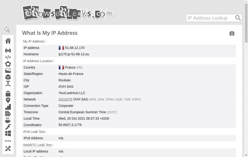 | https://browserleaks.com/ip | Wed, 20 Oct 2021 04:57:37 GMT | Archived webpage |