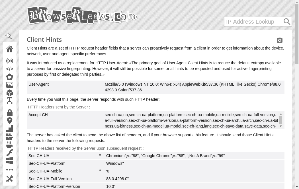 | https://browserleaks.com/client-hints | Wed, 20 Oct 2021 05:19:38 GMT | Archived webpage |