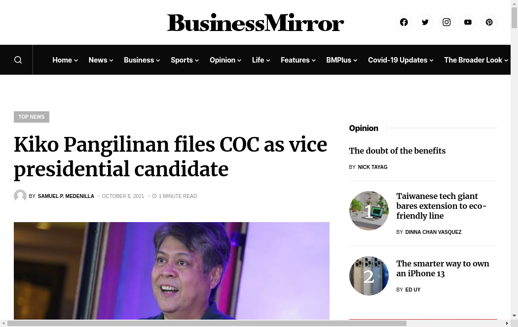 | https://businessmirror.com.ph/2021/10/08/kiko-pangilinan-files-coc-as-vice-presidential-candidate/ | Sun, 24 Oct 2021 02:52:12 GMT | Archived webpage |