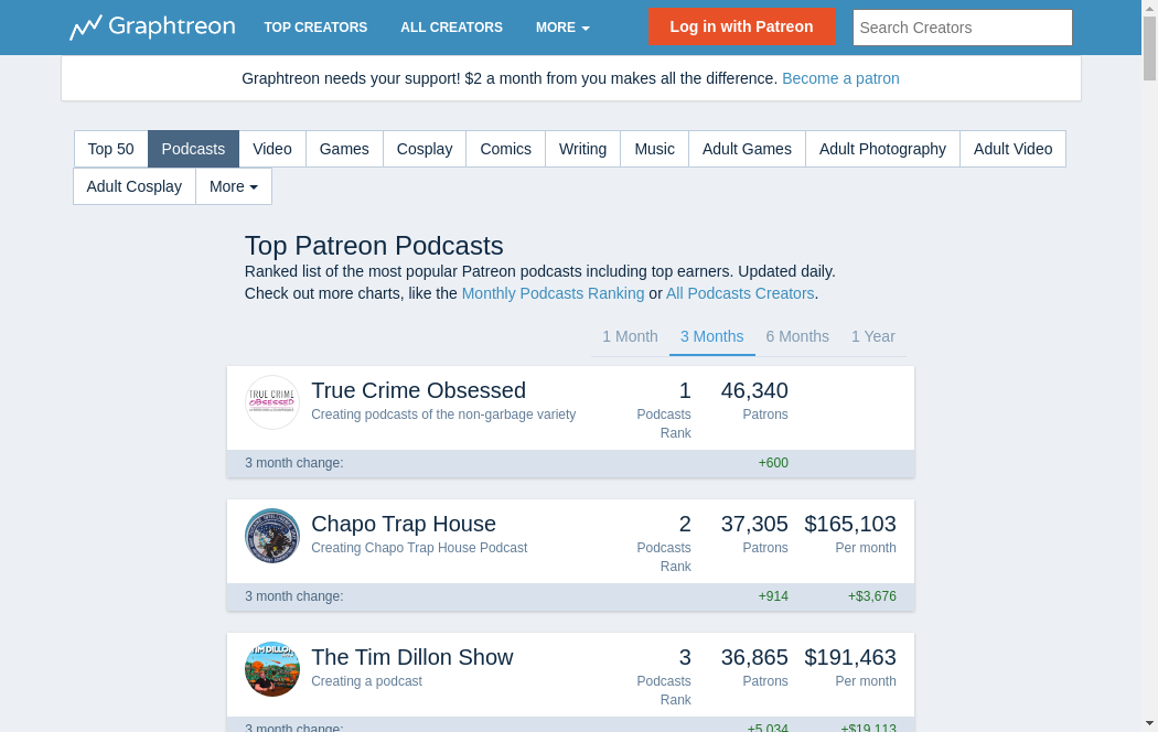 | https://graphtreon.com/top-patreon-creators/podcasts | Sun, 21 Nov 2021 22:09:07 GMT | Archived webpage |