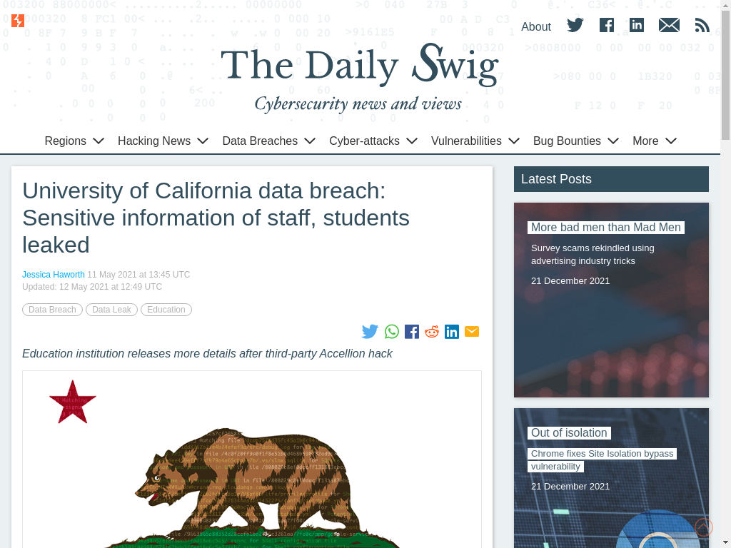 | https://portswigger.net/daily-swig/university-of-california-data-breach-sensitive-information-of-staff-students-leaked | Wed, 22 Dec 2021 05:16:42 GMT | Archived webpage |