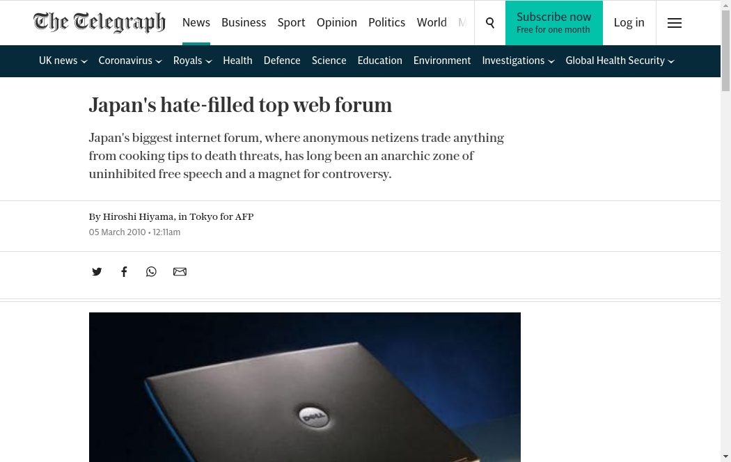 | https://www.telegraph.co.uk/expat/expatnews/7375330/Japans-hate-filled-top-web-forum.html | Wed, 27 Oct 2021 03:32:55 GMT | Archived webpage |