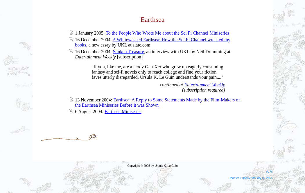 | http://www.ursulakleguin.com/Index-EarthseaMiniseries.html (Orig site: https://web.archive.org/web/20050106014422/http://www.ursulakleguin.com/Index-EarthseaMiniseries.html) | Thu, 16 Sep 2021 17:05:36 GMT | Archived webpage |